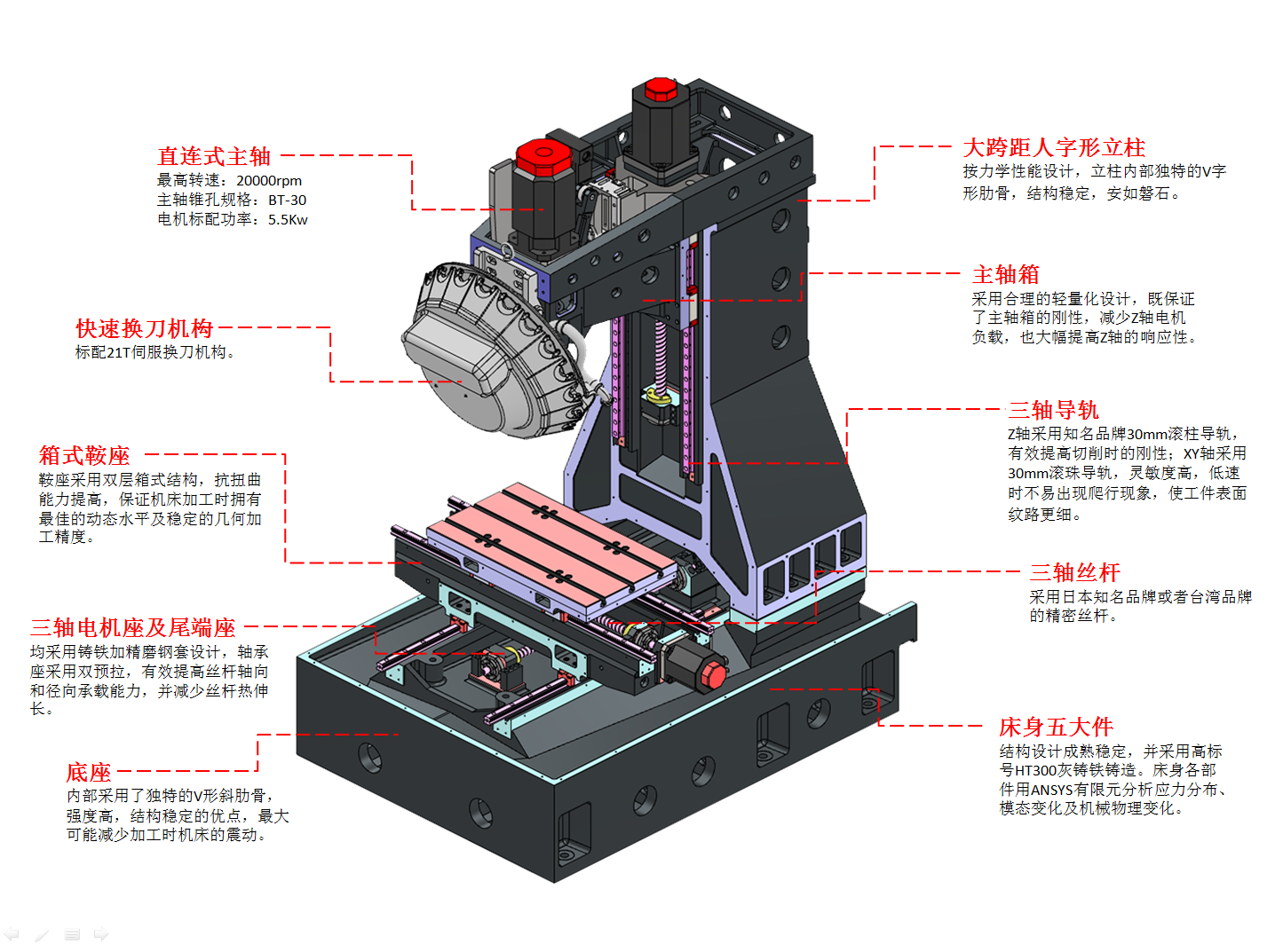 4:低惯性的主轴设计,高稳定性,夹臂刀库换刀快速准确,换刀