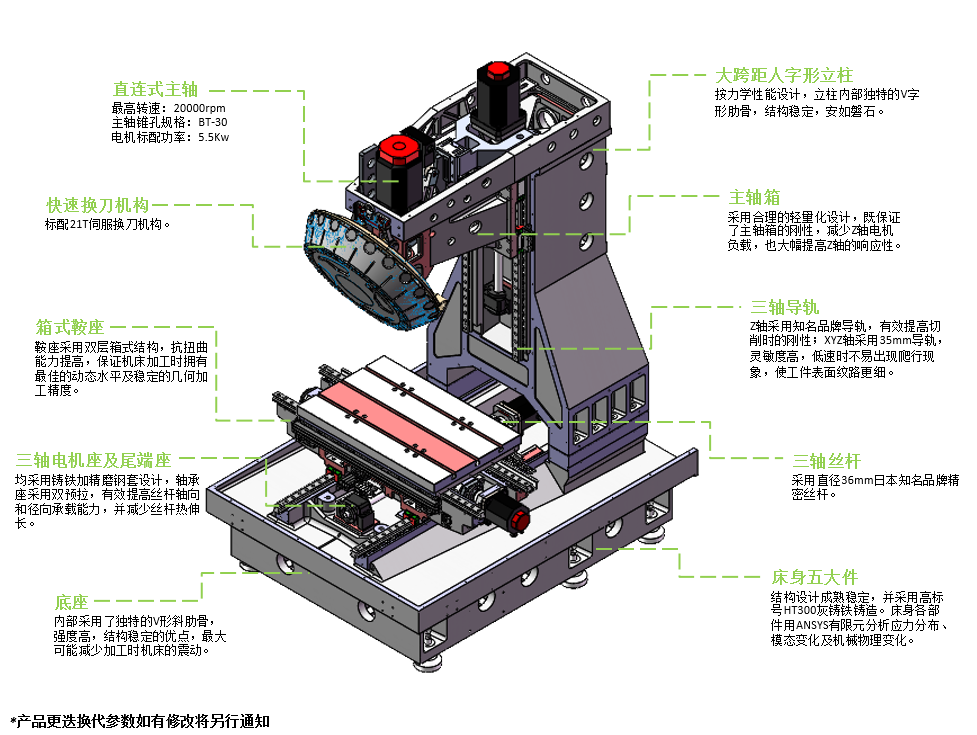 2. 采用21T伞形伺服刀库,换刀时间仅2.5秒,响应迅捷。